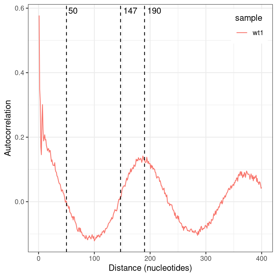 An alternative way to visualize or measure nucleosome repeat length is to plot the autocorrelation of reads. This is obtained by shifting the reads relative to themselves and calculating the pearson correlation of the modification vector in the overlapping range. As you can see in the plot below, this shows high correlation for the first ~50 nucleotides (corresponding to the average length of a nucleosome linker or footprint), then switches to negative correlations before rising again and peaking at about 190 nucleotides (the average nucleosome repeat length).