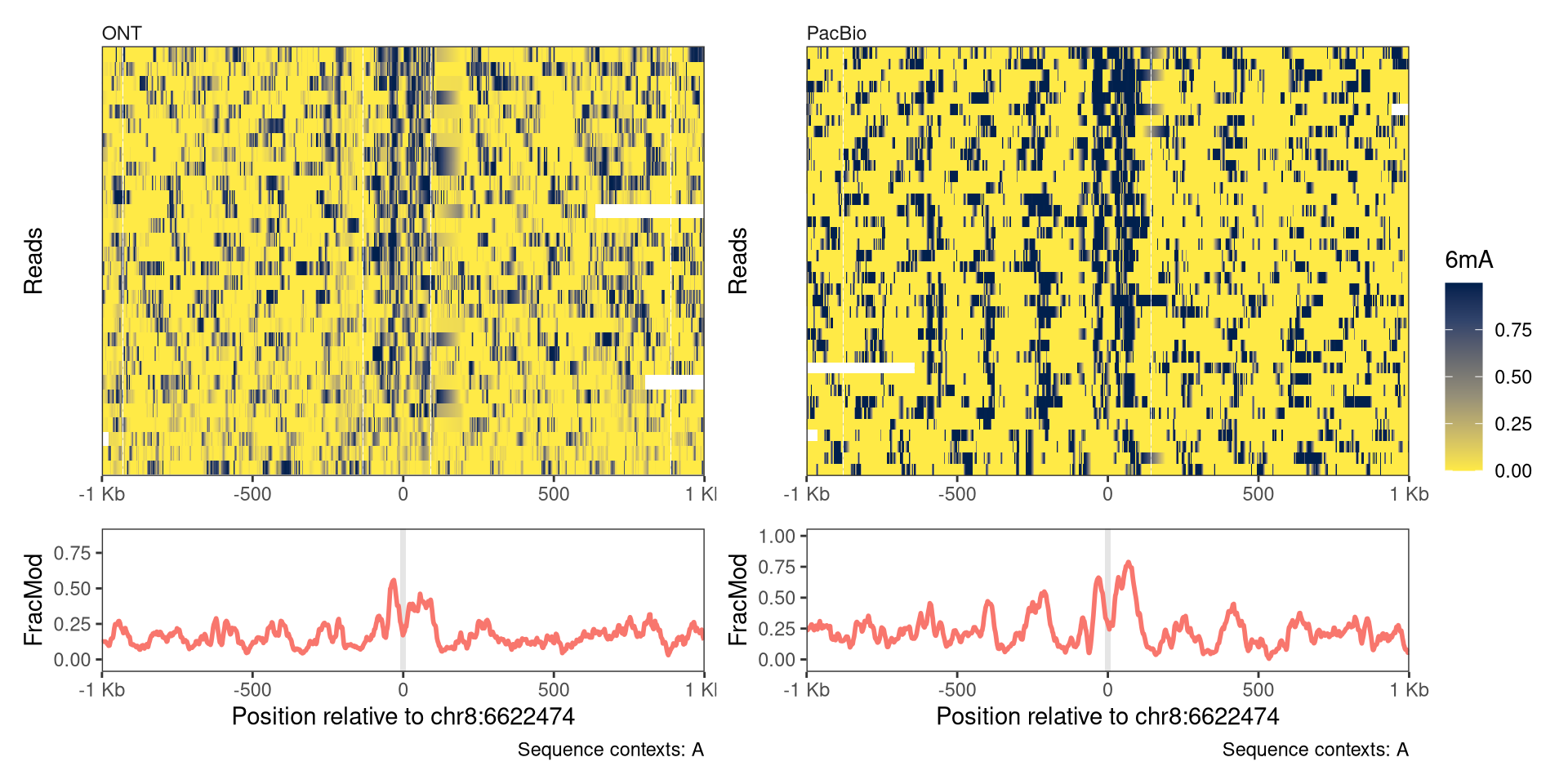 Most of the data that is used for illustration in this book has been generated on an Oxford Nanopore (ONT) sequencer, but modBam files are standardized and SingleMoleculeGenomicsIO and footprintR are agnostic to the sequencing technology used to generate them. In this example, we will visualize a single locus around a bound CTCF site for ONT- and a PacBio-generated datasets: