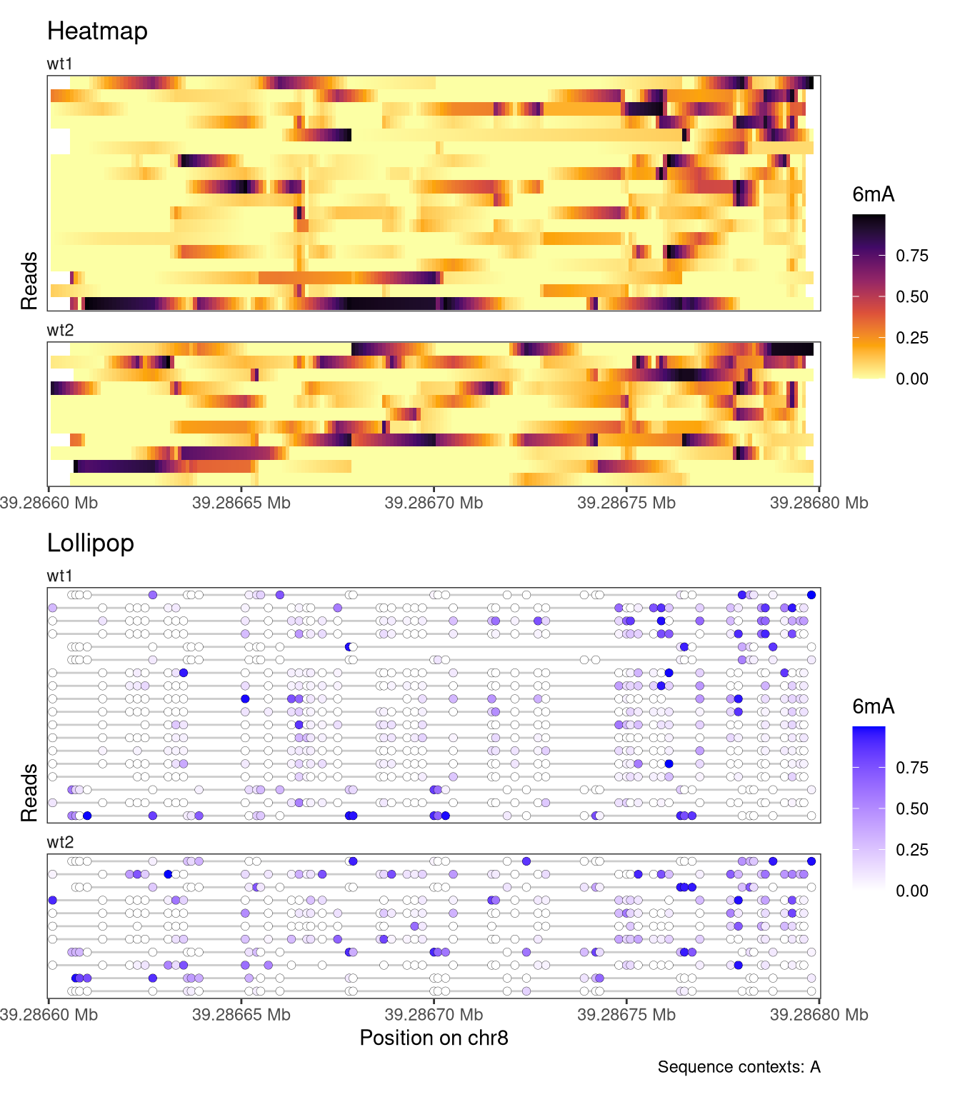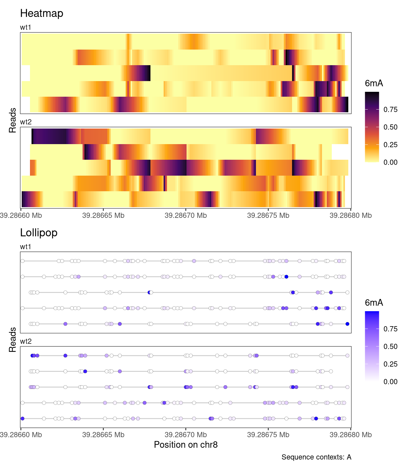 Read-level plots can be generated using either the Heatmap or the Lollipop track type, assuming that there is at least one assay with read-level data present in the provided SummarizedExperiment object. The heatmap visualizes each base with a modification call as a filled rectangle, with optional interpolation between observations. The lollipop plot visualizes each base with a modification call as a filled circle. In both cases, the fill color represents the recorded modification probability of the base. For the read-level plot tracks, the trackData argument specifies the name of the (read-level) assay that should be displayed.